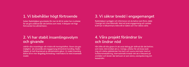För första gången i Radiohjälpens mångåriga historia har vi nu tagit steget att formulera hur vi strategisk kan fortsätta vara där det behövs som mest; att förändra liv och lindra nöd i allmänhetens tjänst. Tack till dig som gör detta möjligt.